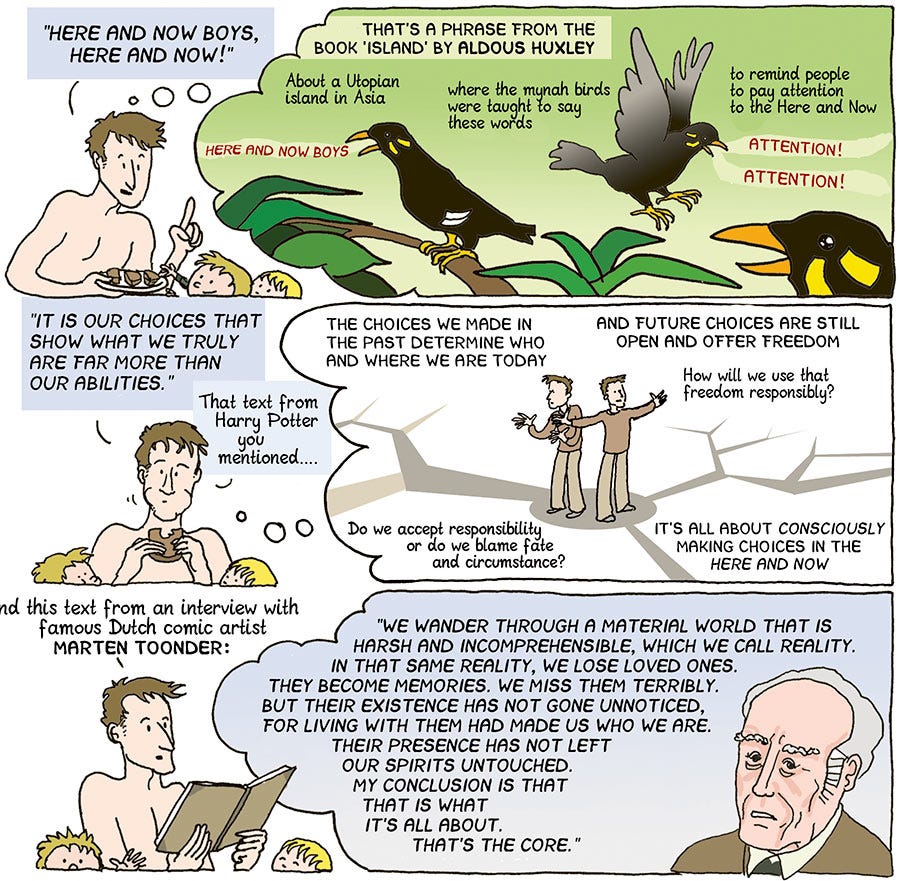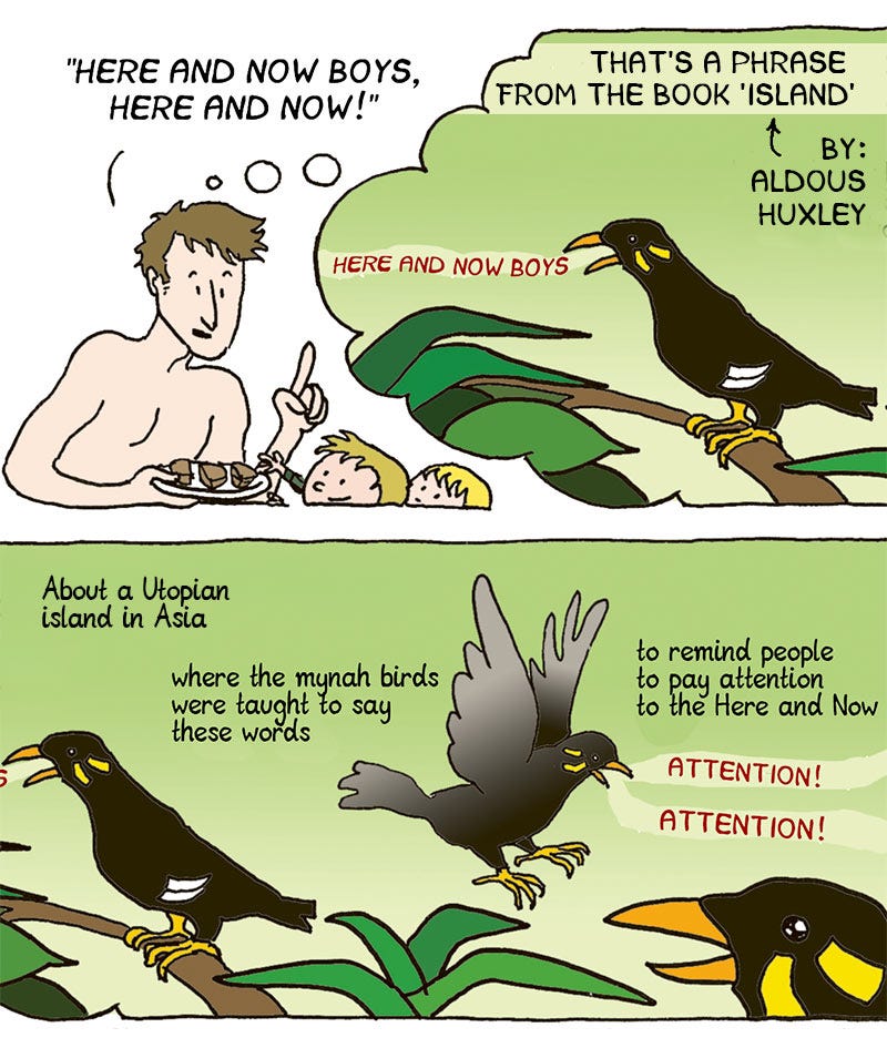 That’s a phrase from the book Island by Aldous Huxley, about a Utopian island in Asia, where the mynah birds were taught to say these words, to remind people people to pay attention to the Here and Now.