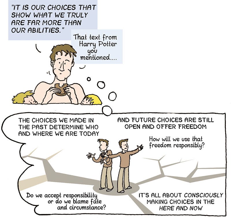 The choices we made in the past determine who and where we are today. And future choices are still open and offer freedom. How will we use that freedom responsibly? Do we accept responsibility or do we blame fate and circumstances?